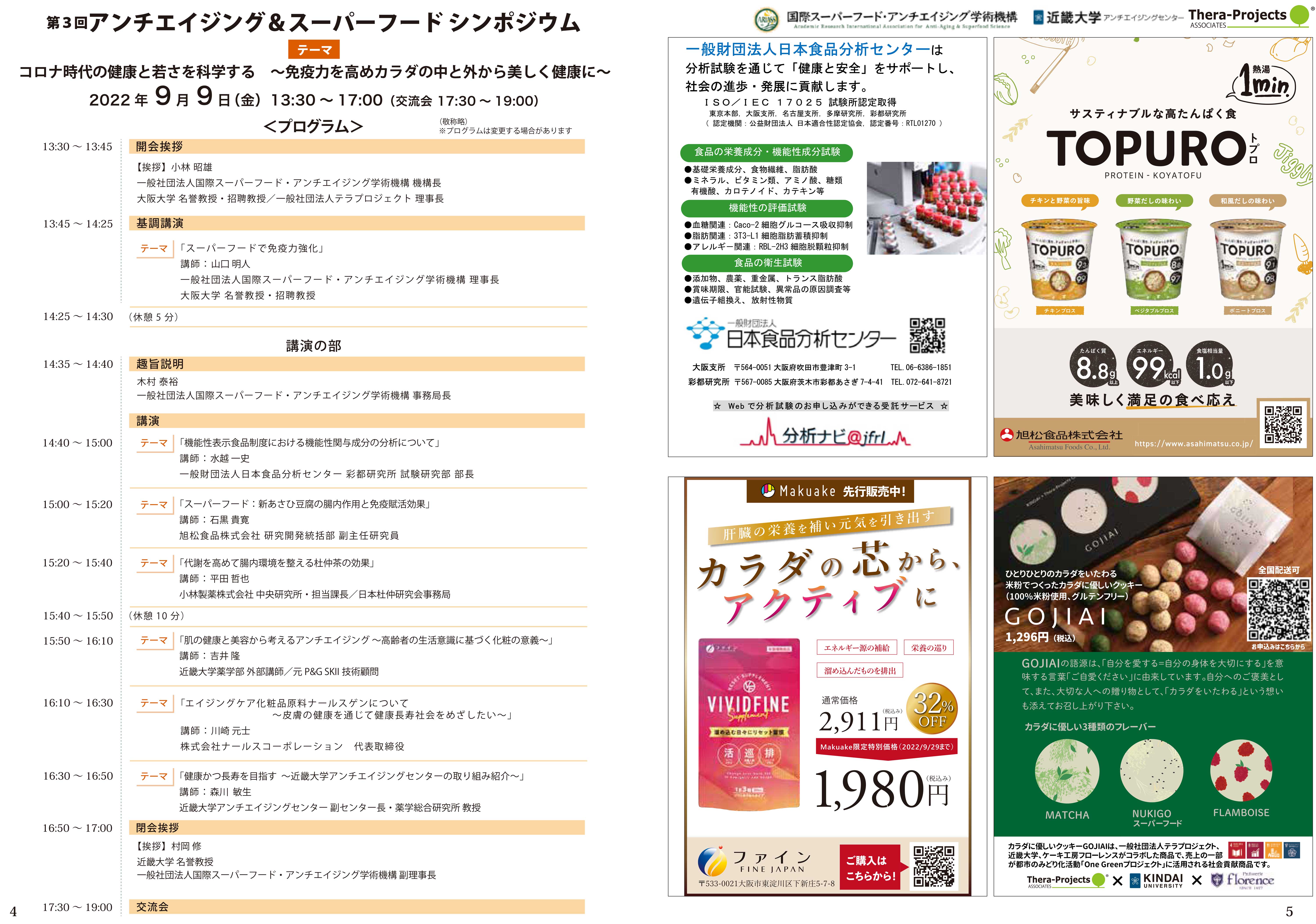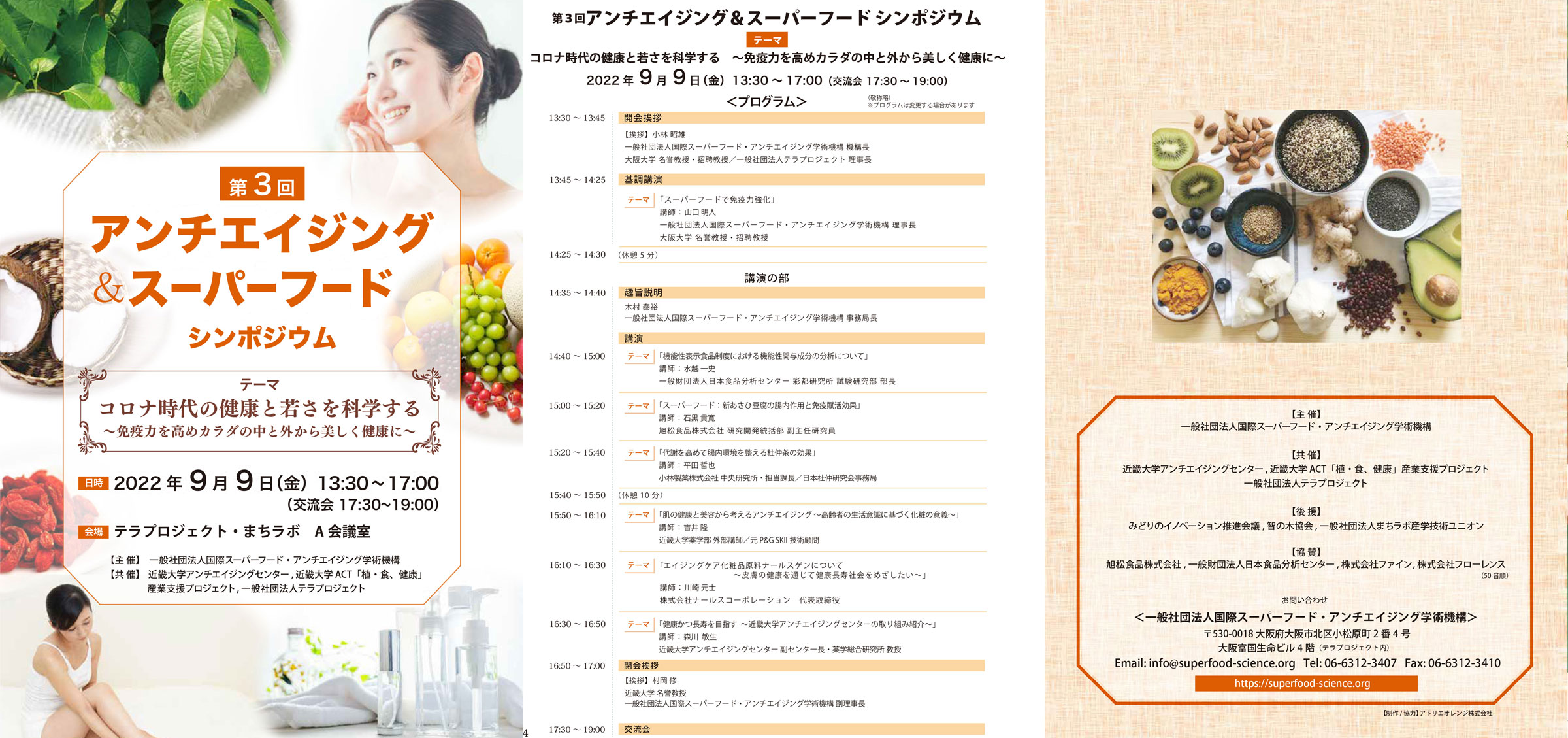 一般社団法人国際スーパーフード・アンチエイジング学術機構は令和4年9月9日(金) に、近畿大学アンチエイジングセンター、近畿大学ACT「植・食、健康」産業支援プロジェクト、一般社団法人テラプロジェクトと共催で、「第3回アンチエイジング&スーパーフードシンポジウム」を開催しました。